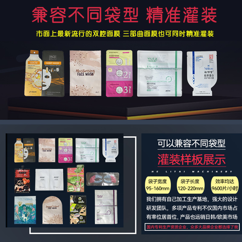 膜灌裝封口一體機,灌裝既可使用標準型面膜袋,也可定制異形袋裝置。 除此之外,可定制噴碼系統(tǒng),噴碼和打碼可以通用。可定制成高配機,適用于醫(yī)藥面膜(可做無添加產(chǎn)品)可與我公司全新開發(fā)的面膜折膜機組成全自動的面膜生產(chǎn)線。